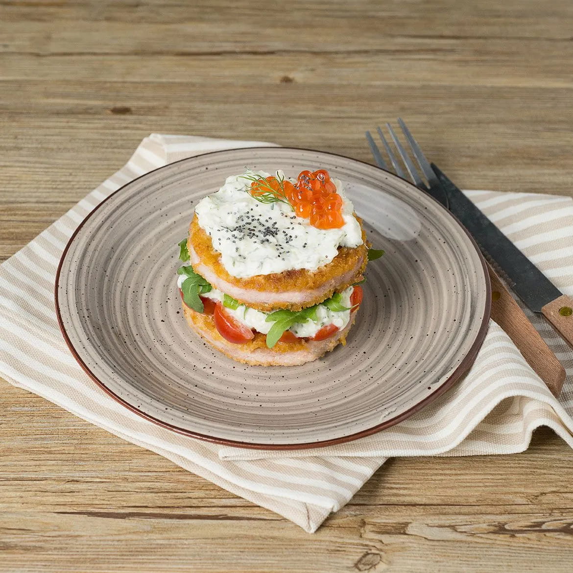 Ecco la ricetta completa della millefoglie di Milanese con rucola e pomodorini, salsa tzatziki all'aneto, uova di salmone e semi di papavero!