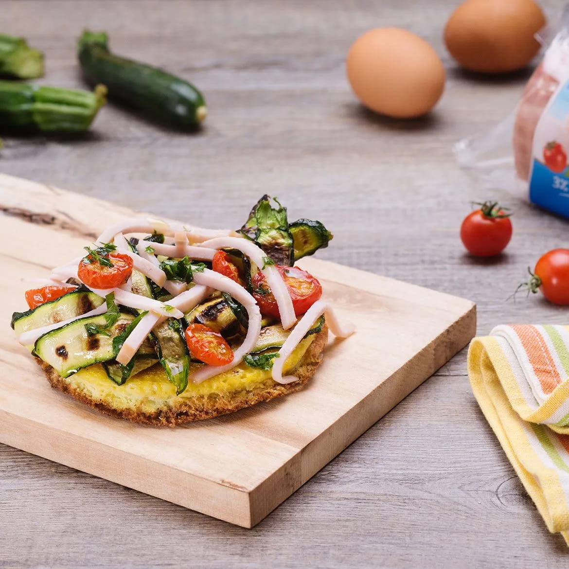 Hier ist, wie man eine köstliche Frittata mit gebackenen Truthahnbruststreifen, gegrillten Zucchini und Kirschtomaten zubereitet!