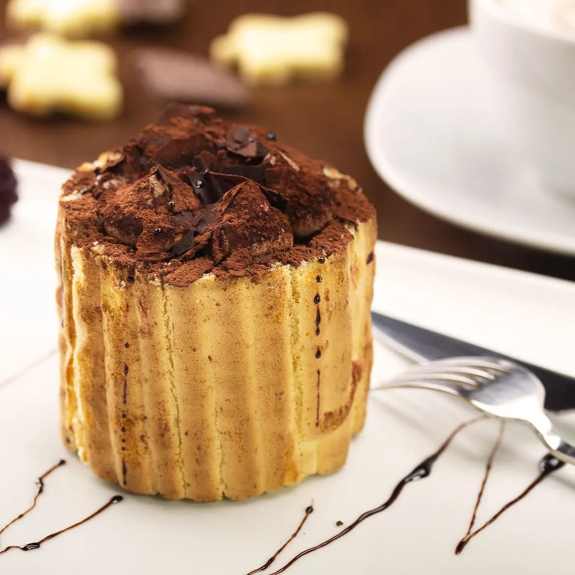 Stellen Sie die Charlotte mit Schokolade mindestens 30 Minuten in den Kühlschrank, bevor Sie sie servieren.