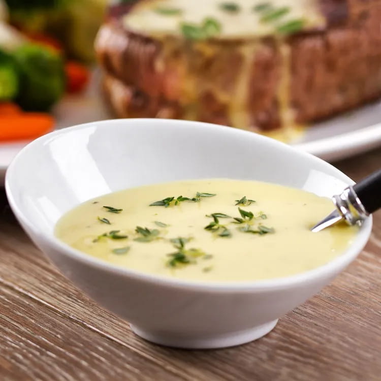 Schlagen Sie das AIA Eigelb gut mit einem Schneebesen und übertragen Sie die Mischung in einen Topf. Halten Sie die Flamme immer niedrig. Fügen Sie die geschmolzene Butter hinzu und mischen Sie die Zutaten. Fügen Sie eine Prise Salz hinzu, eine Prise Pfeffer und, nach Belieben, eine Prise Muskatnuss.
