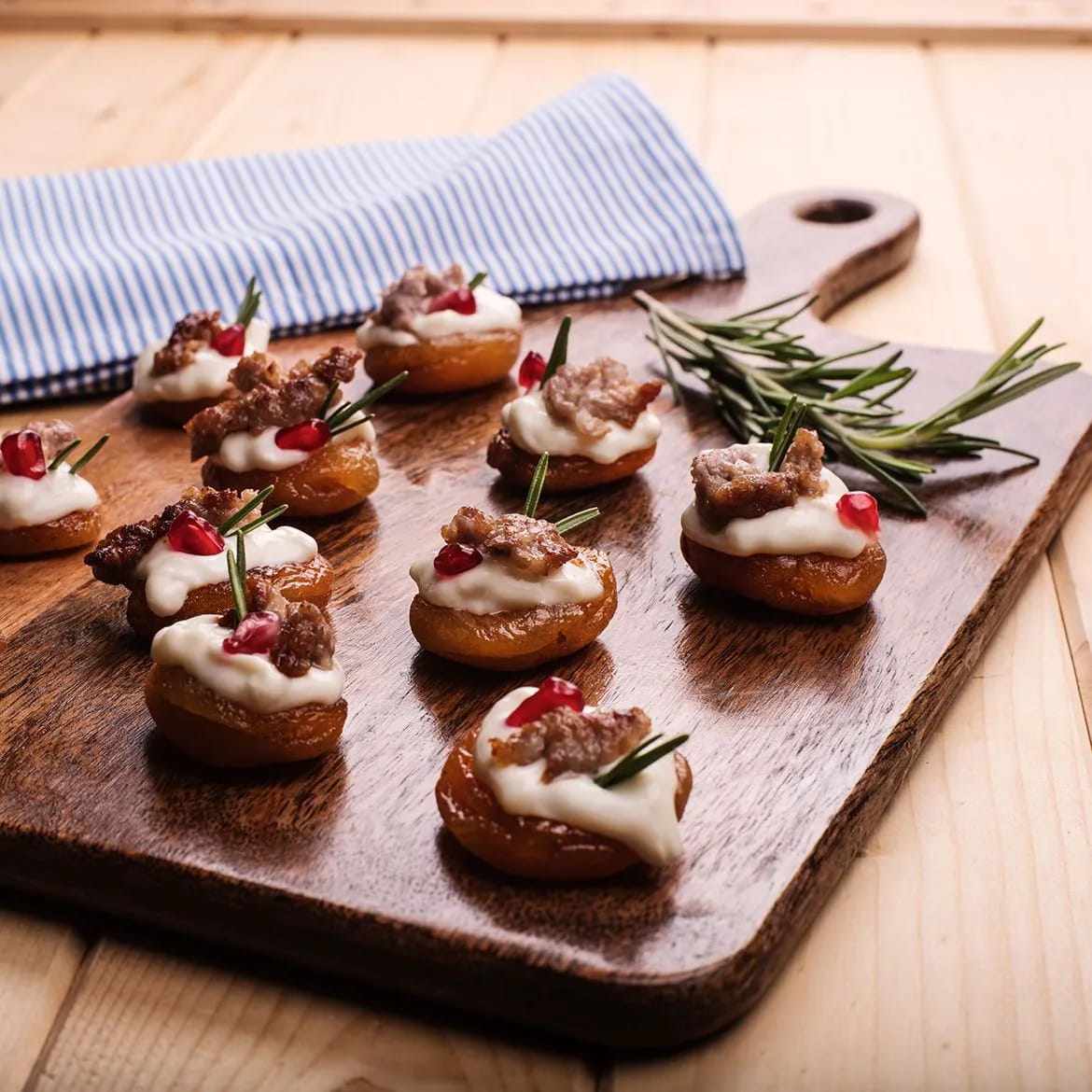 Es gibt keinen besseren Weg, das Silvester-Dinner zu beginnen als mit einem köstlichen, eleganten Aperitif, der auch ein gutes Omen für das neue Jahr ist. Die getrockneten Aprikosen mit Stracchino, Wurst, Granatapfel und Rosmarin sind kleine Häppchen, die Ihrem Silvester-Aperitif einen einzigartigen Geschmack verleihen.