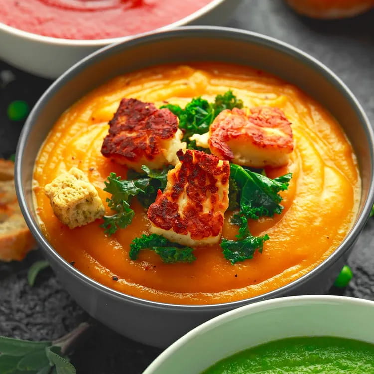 Sie können Ihre Kürbissamtsuppe zum Sonntagsmittagessen servieren, oder Sie können sie in einem luftdichten Behälter aufbewahren und sie am nächsten Tag ins Büro mitnehmen! Hier ist das Rezept für die leichte Samtsuppe mit Hühnchenstücken!