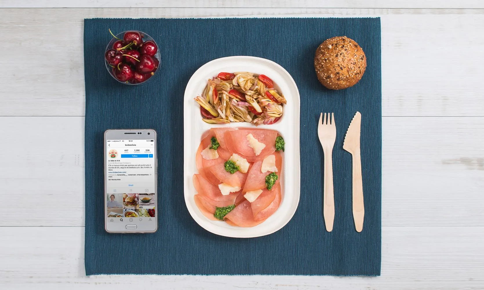 Wir möchten Ihnen eine wirklich leckere Lunchbox vorstellen, die aus leichtem Carpaccio mit Basilikumsauce, Grana-Flocken, Vollkornbrötchen, Artischockensalat und Kirschtomaten und Kirschen besteht. Dies ist eine Lunchbox, die für den Karrieremenschen gedacht ist, der nie sein Telefon vergisst, auch nicht während der Mittagspause, und sich entscheidet, etwas Gutes und Schönes zu genießen, das auch fotografiert und auf sozialen Netzwerken mit Freunden geteilt werden kann.