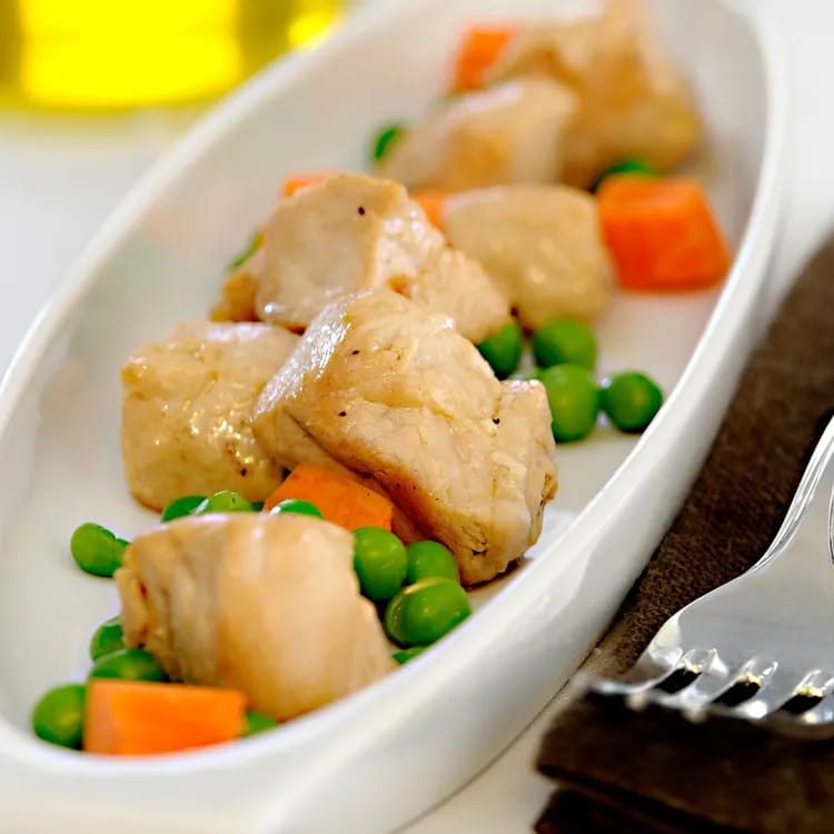 Zuerst schneiden Sie die Truthahnkeule in kleine Stücke und lassen Sie in der Zwischenzeit die Butter in einer Antihaftpfanne schmelzen. Wälzen Sie die Truthahnstücke in Mehl und braten Sie sie zusammen mit der geschmolzenen Butter in der Pfanne an.