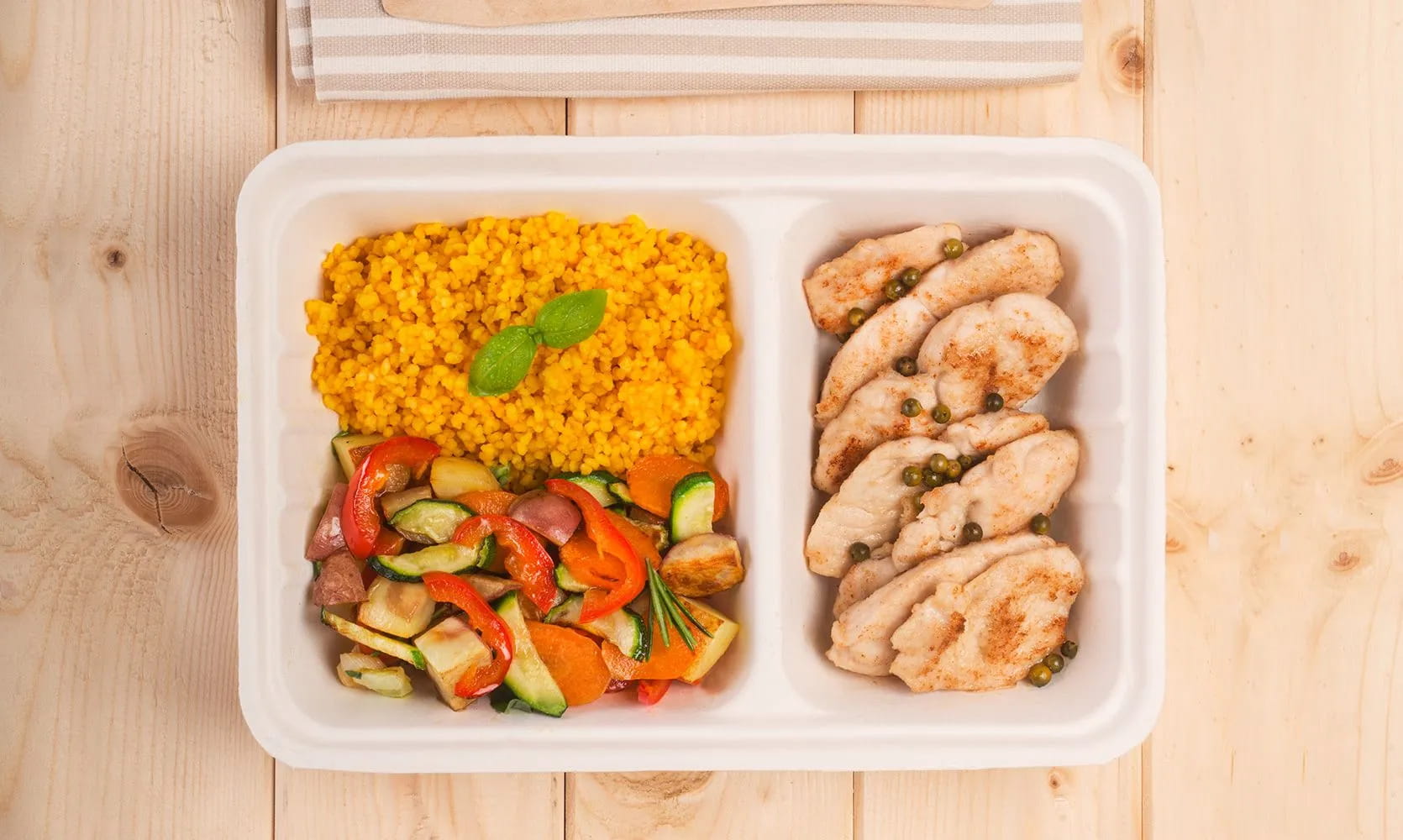 Es ist nicht immer einfach, die Lunchbox für die Mittagspause im Büro zu füllen. Oft hat man keine Lust, am Vorabend zu kochen oder man hat keine Ideen. Heute schlagen wir Ihnen ein einfaches und schnelles Rezept für eine leckere Lunchbox vor: Truthahnfilet mit grünem Pfeffer und mediterranem Ofengemüse und Couscous mit Safran und Basilikum. Es handelt sich um eine schmackhafte Zubereitung, die perfekt ist, wenn Sie ein komplettes Gericht genießen möchten, das Ihnen die richtige Energie gibt, um den Nachmittag bei der Arbeit zu bewältigen. Einfach und schnell zuzubereiten, hier ist das Rezept für die Lunchbox mit Truthahnfilet mit grünem Pfeffer und mediterranem Ofengemüse und Couscous mit Safran und Basilikum!