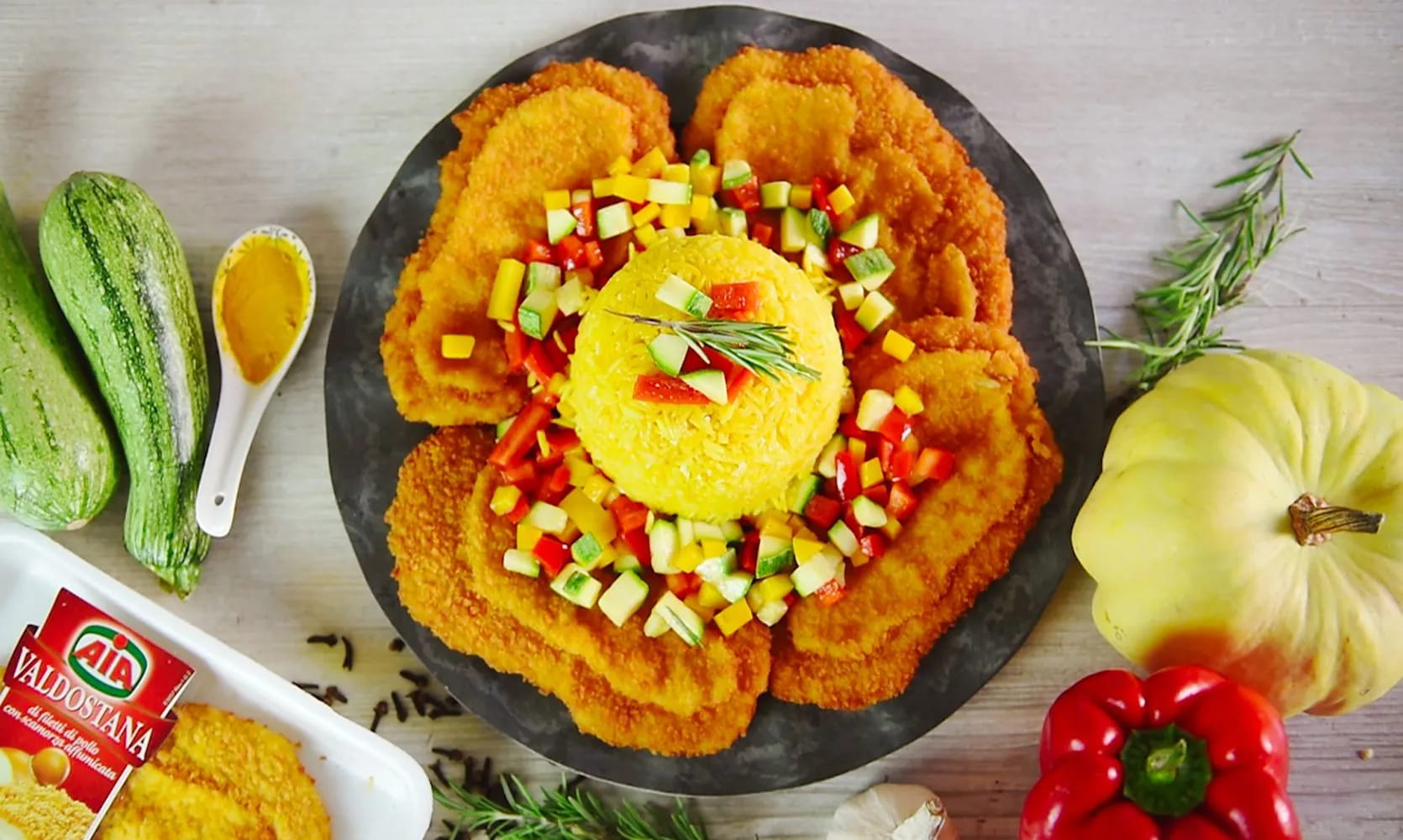 Hier ist das vollständige Rezept für Valdostana mit Basmatireis und Gemüsewürfeln!