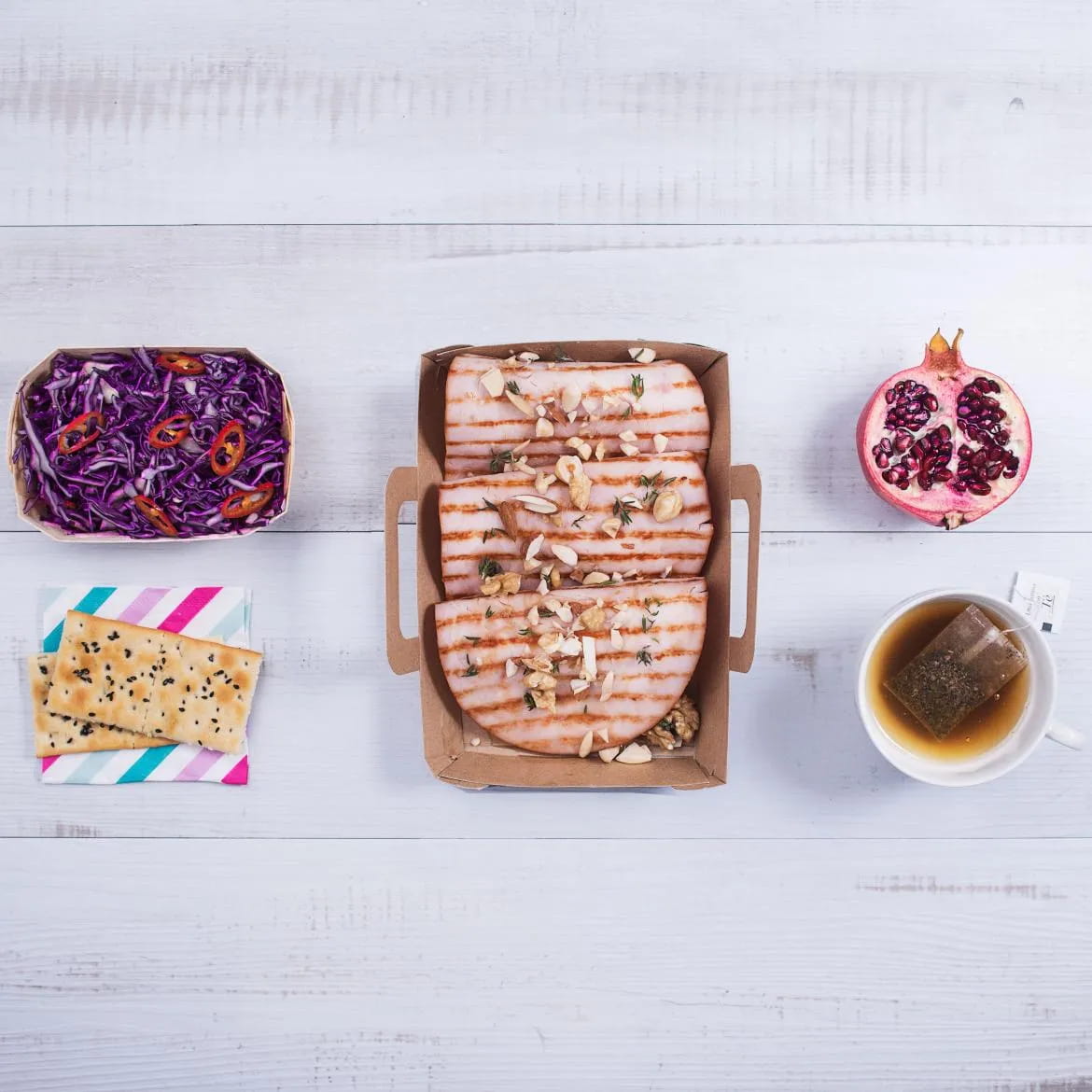 Perfect for returning to the office after the Christmas holidays, the lunch box based on AIA Oven Roasted Turkey Breast Slice grilled with honey and dried fruit, cabbage salad, sesame crackers, pomegranate will give you a moment of real pleasure during lunch break. In this preparation, the AIA Oven Roasted Turkey Breast Slice is made even more tasty by the sweetness of the honey and the crunchiness of the dried fruit, while the side dish of cabbage salad, sesame crackers and pomegranate completes the dish.