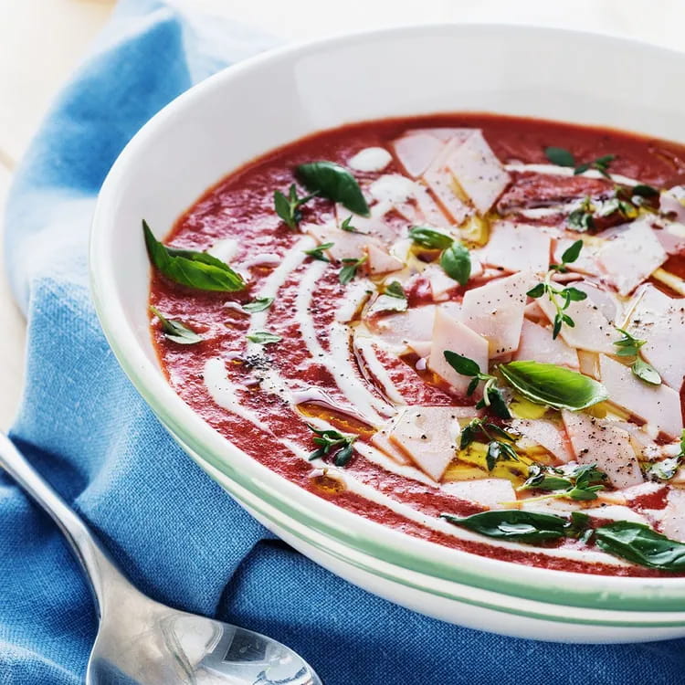 This recipe is indeed a tasty alternative to the classic gazpacho, but without the use of peppers and with the addition of more delicate, healthy, and digestible ingredients such as - precisely - the turkey, the smoked paprika and the crème fraîche, a sauce made from yogurt and cream, which makes the cold soup inviting and creamy.