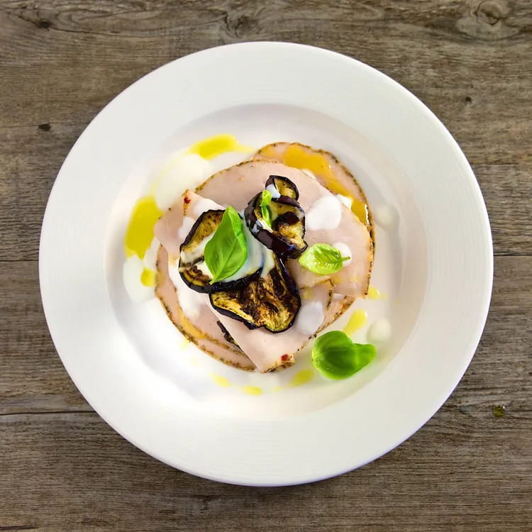 Compose the layers of the Sardinian millefeuille in the following order: a slice of carasau bread, the cheese with turmeric, AIA baked chicken aeQuilibrium, the zucchini, the sliced brie and finally again the carasau bread.