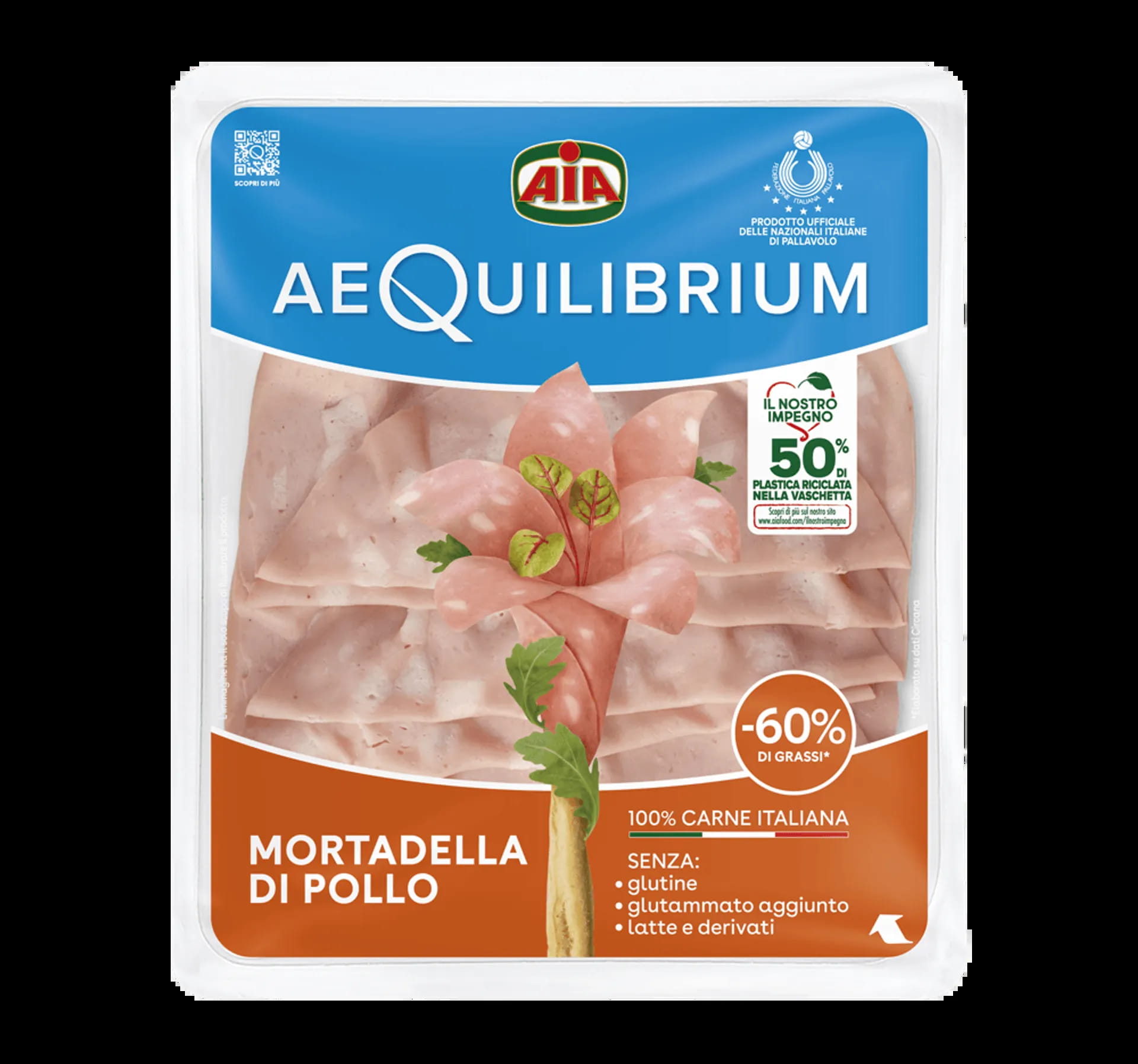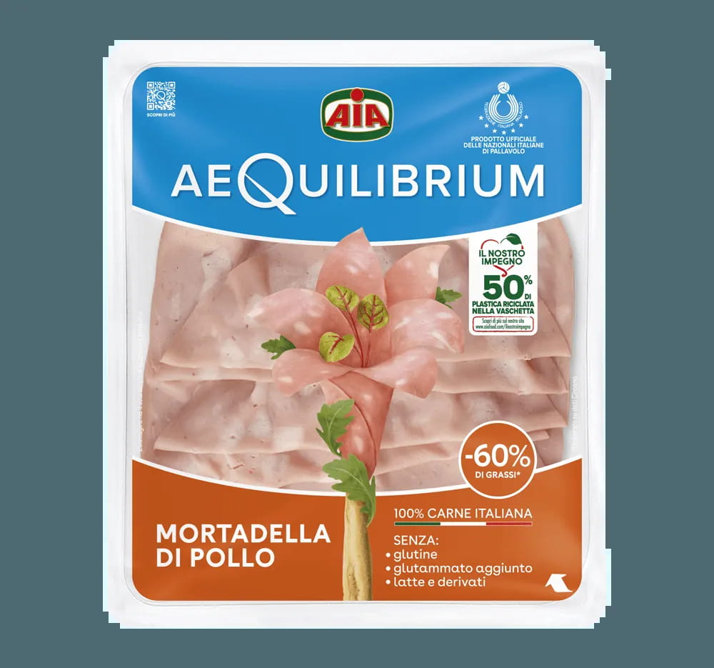 AeQuilibrium Chicken Mortadella -60% fat compared to the average of the best-selling mortadella cold cuts in Italy.