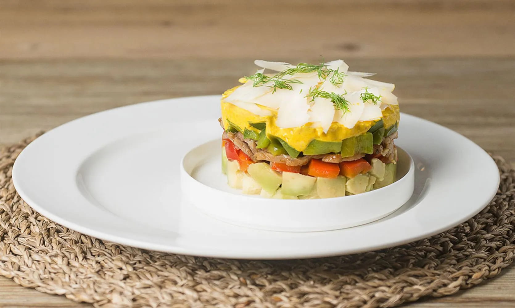 Cut the leeks into slices and stew them in a pan with oil, salt and turmeric. Blend the leeks until you get a sauce. Finally, compose the tartare in layers following this order: avocado, red peppers, AIA Kebab, green peppers, leek sauce with turmeric, grana shavings and dill.