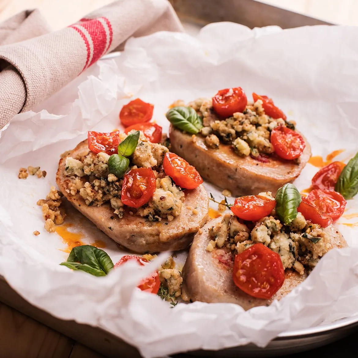 Pass the slices of BonRoll in a pan and, when they are cooked, arrange them on a serving dish. Cover the slices of BonRoll with the basil crumble and with the confit cherry tomatoes.