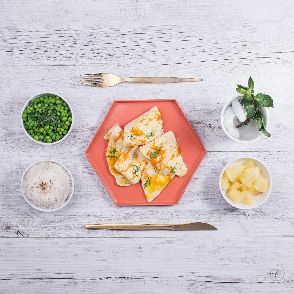 Here is the tasty recipe for citrus scaloppine with dill, basmati rice, mint peas, pineapple and mint water!