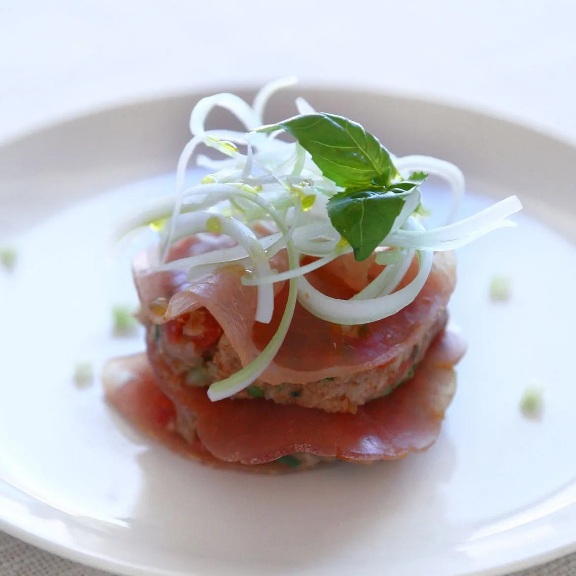 With the help of a pastry cutter, arrange a slice of turkey bresaola on the bottom, then a little panzanella and more bresaola.