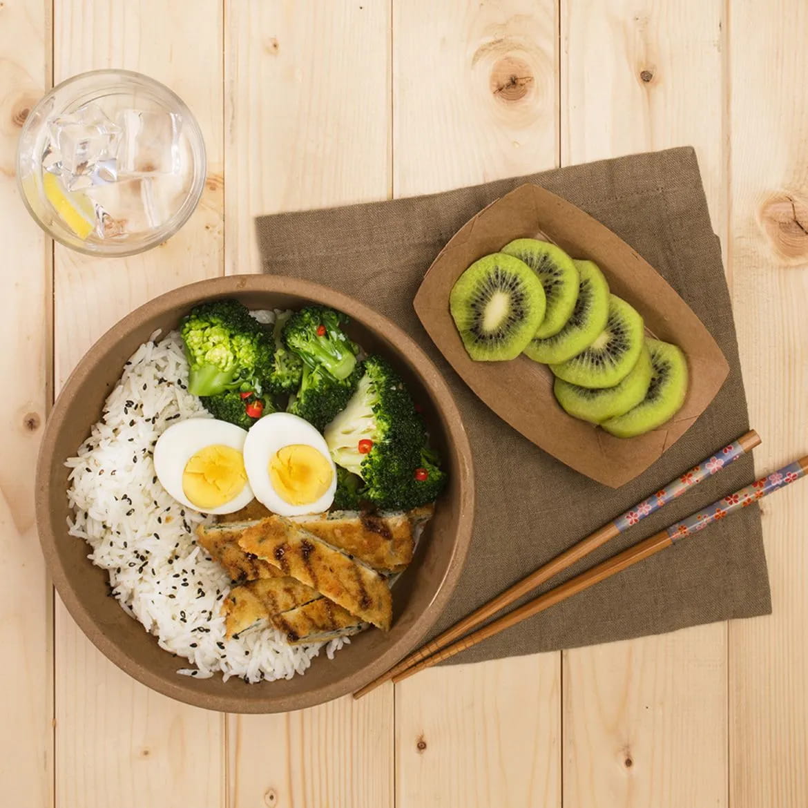Here is the recipe for the spinacina with teriyaki sauce, enriched with white rice with sesame, boiled egg, broccoli and kiwi.