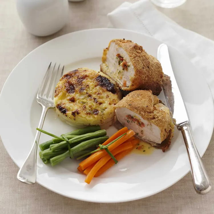 All that remains is to arrange the stuffed chicken on a serving dish and serve it with its cooking base.