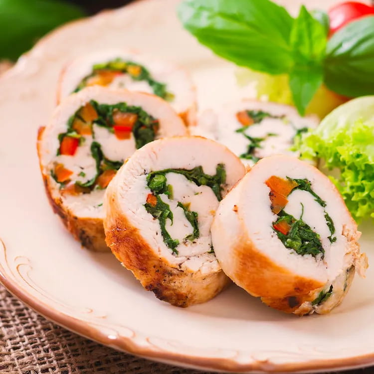 First, spread the AIA Turkey Thigh Thin slices on a horizontal surface. On each slice, place a slice of ham and a couple of thin slices of mozzarella, dabbed with a sheet of absorbent paper. Sprinkle with chopped pistachios and roll up the rolls.