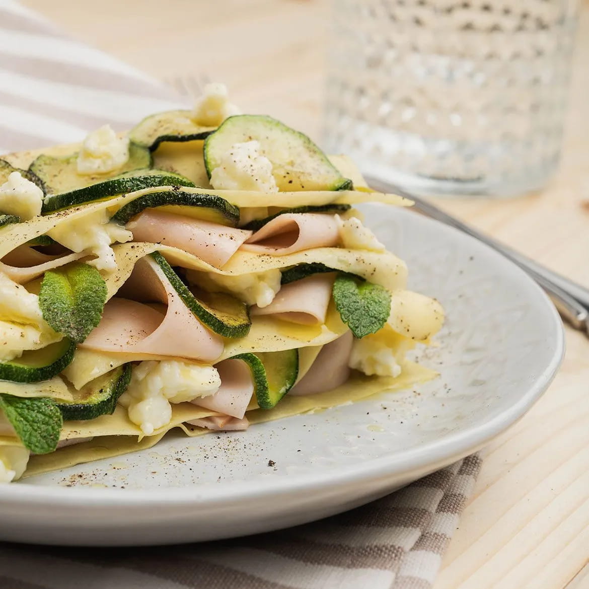 Roll out the pasta into a thin sheet and cut it into 10 cm squares. In a small casserole, put a layer of pasta, some strips of AIA aeQuilibrium Oven Roasted Turkey Breast, the zucchinis and some tufts of stracchino cheese.