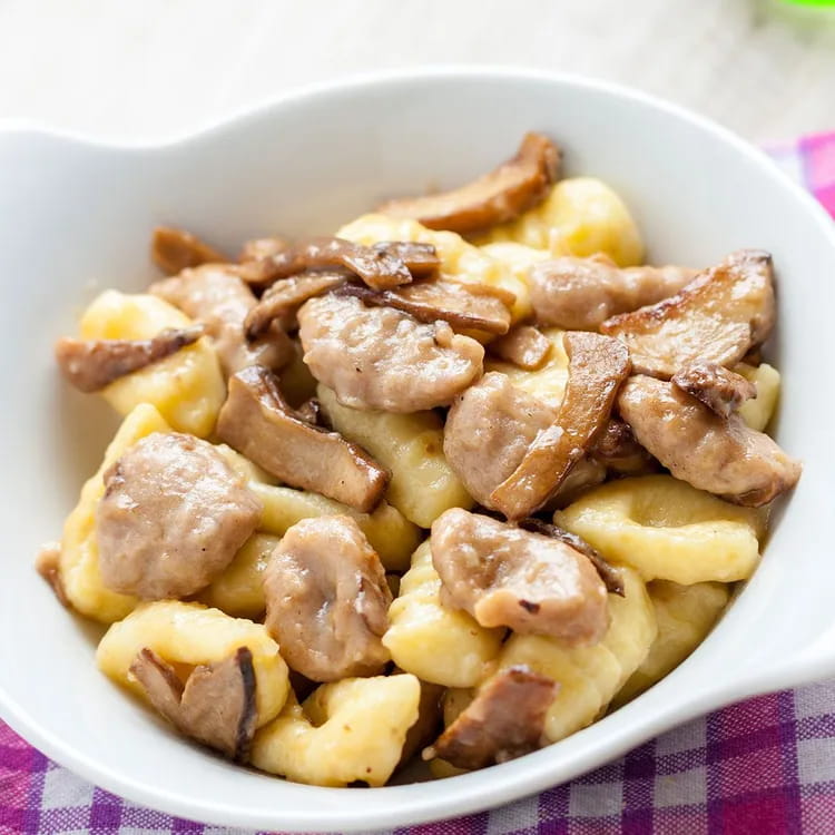 Tagliate a fette aeQuilibrium trancetto di petto di tacchino e poi tagliatelo a tocchetti. Lessate gli gnocchi in abbondante acqua bollente salata, scolateli quando saliranno a galla e tuffateli nella padella con il condimento.