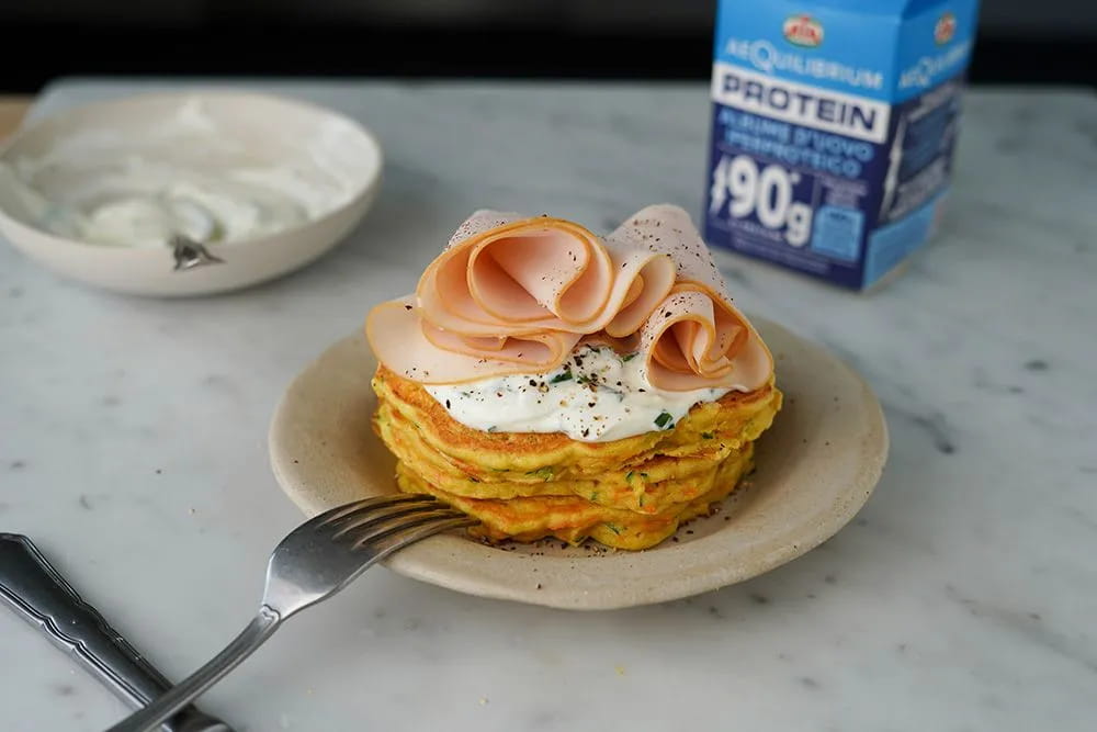 Soffici, nutrienti e sorprendentemente leggeri: questi pancake salati uniscono la forza proteica degli albumi AeQ PROTEIN e della farina di ceci alla freschezza delle verdure grattugiate. L’aggiunta di carote e zucchine direttamente nell’impasto non solo completa il profilo nutrizionale, ma rende la consistenza più morbida e il risultato finale ancora più leggero. Vi consigliamo di farcirli con il Petto di Tacchino AeQuilibrium per arricchirli di energia e gusto.