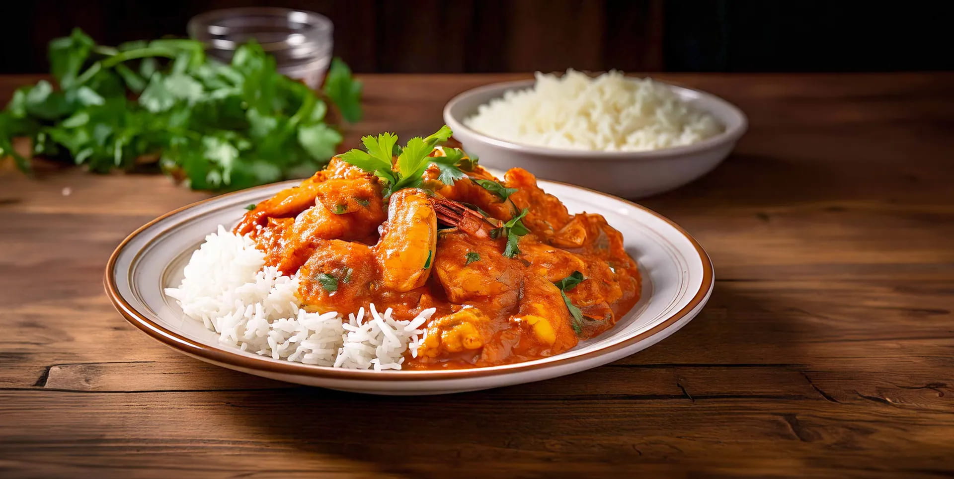 Ecco la ricetta del Pollo e gamberi al curry con riso basmati.