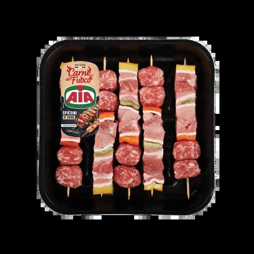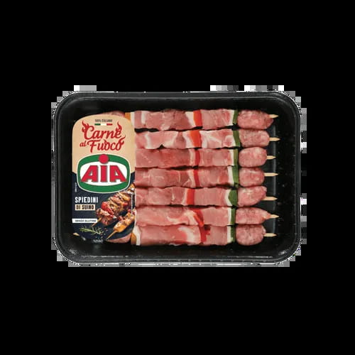 Spiedini costituiti da tagli teneri di suino, separati da peperoni e sfoglie di pancetta, accompagnati all'estremità da due chicchi di salsiccia.