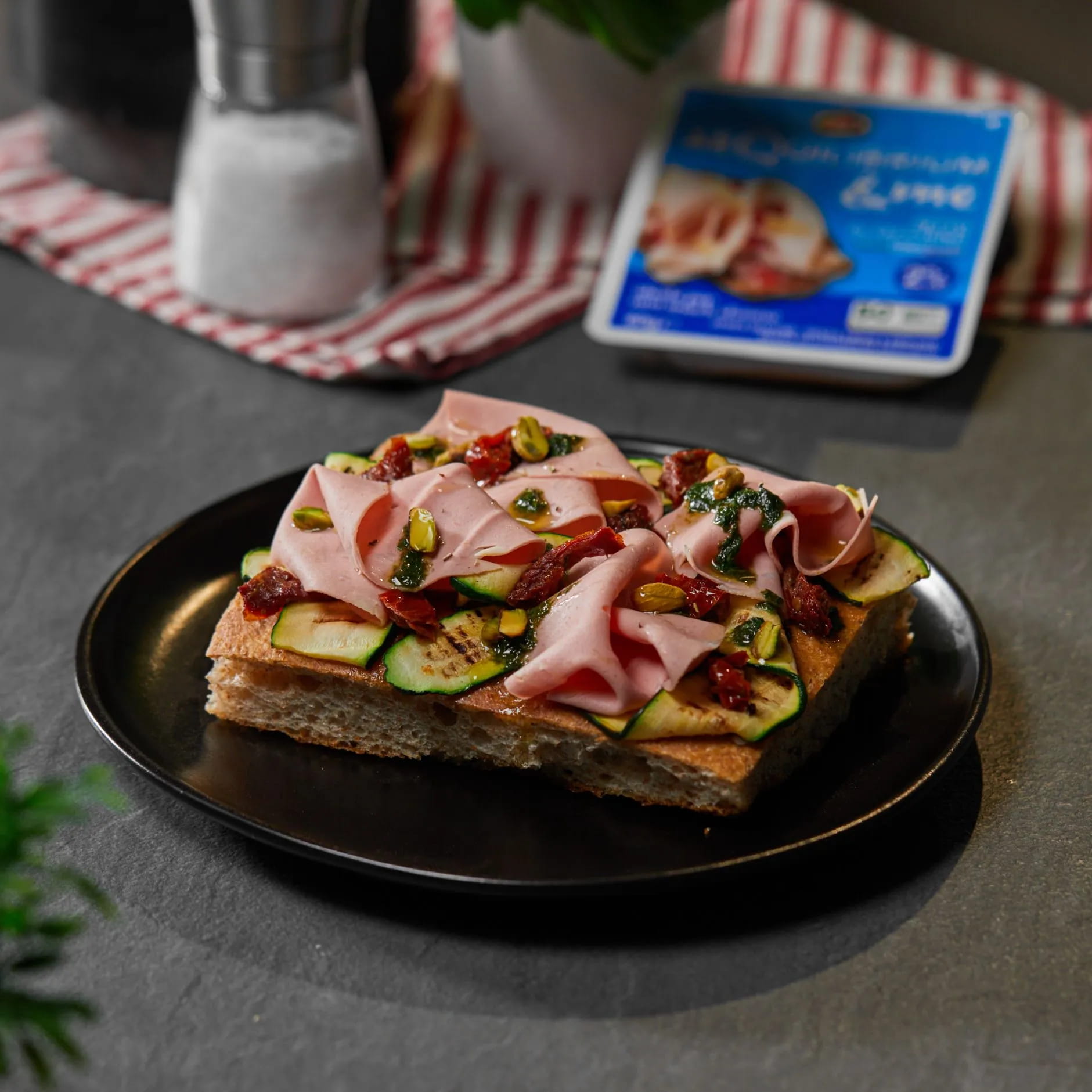 Distribuisci uniformemente sopra la focaccia le fette di mortadella di pollo, le zucchine grigliate, i pistacchi tritati e i pomodorini secchi tagliati a pezzetti. Spolvera con un po' di origano, sale e pepe a piacere.