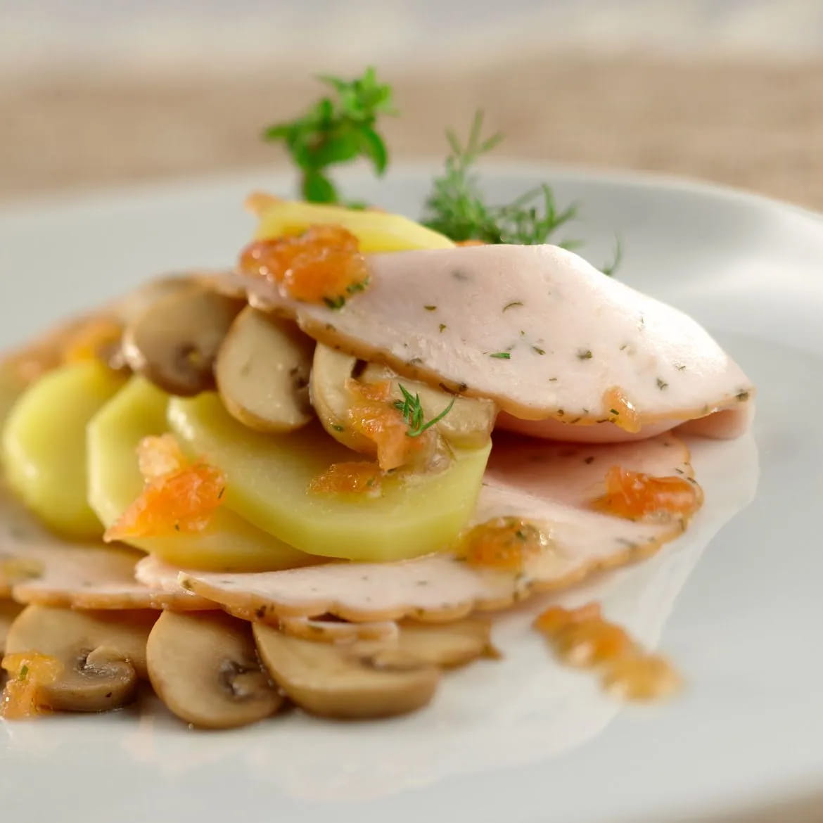 Ora siete pronti ad impiattare. Sistemate una fetta di patate, una o due fette di petto di tacchino alle erbette e ancora un cucchiaio di funghi. Chiudete con una rondella di patate e condite con la salsina ottenuta con l’acqua dei funghi.