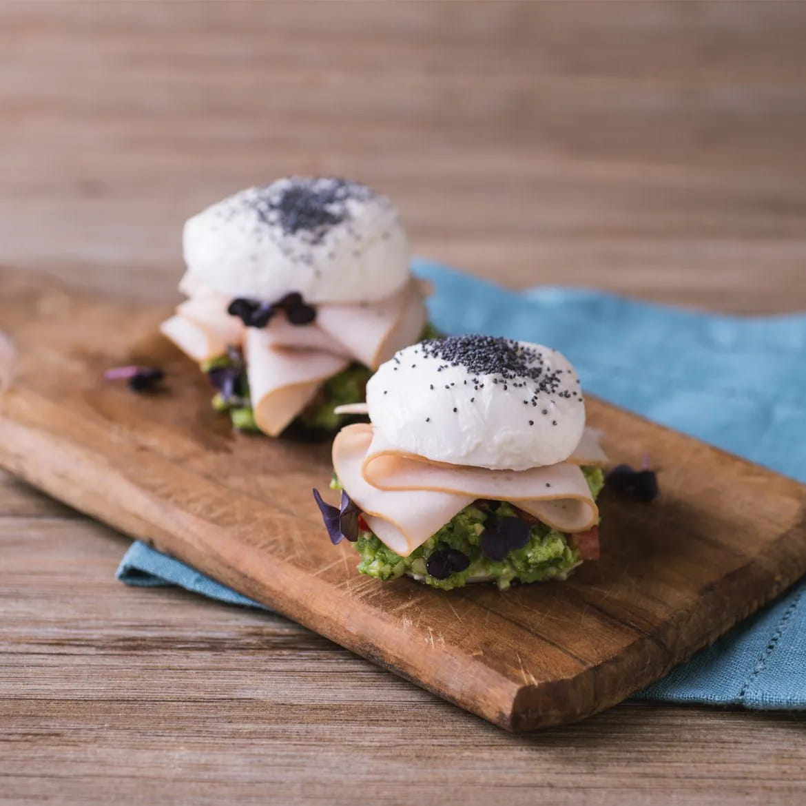 Farcite la mozzarella come fosse un panino aggiungendo il pesto di piselli, i pomodori, il petto di pollo al forno aeQuilibrium di AIA e qualche germoglio. Decorate la mozzarella con i semi di papavero e qualche fogliolina di menta o basilico.