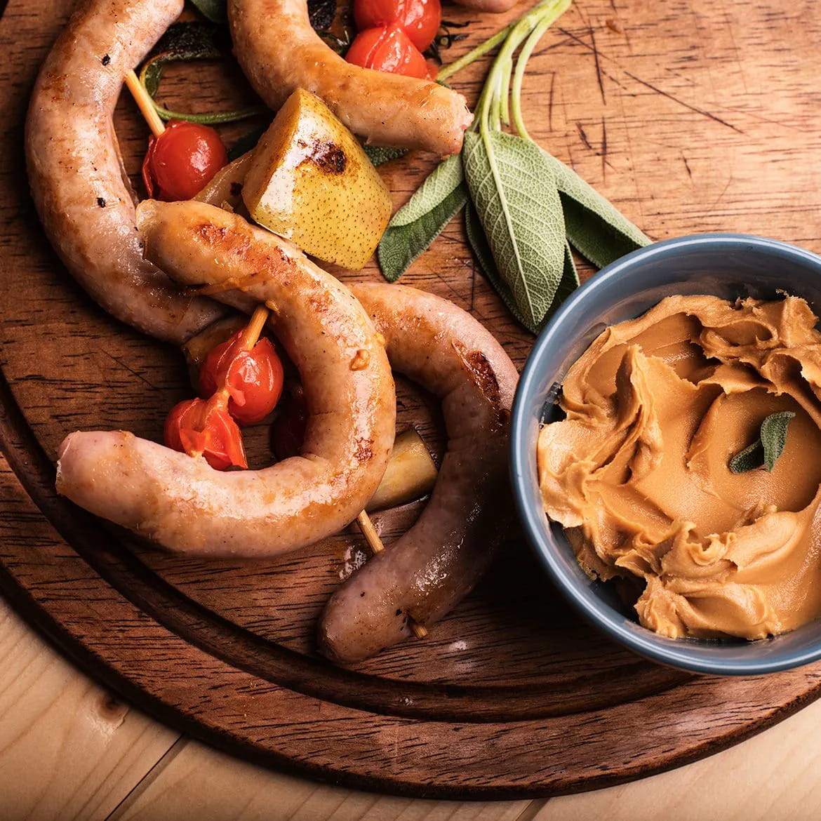 Ecco la ricetta degli spiedini di salsiccia con pere, salvia e salsa di arachidi!