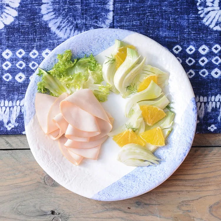 Arrotolate le fette di tacchino e tagliate a rondelle.