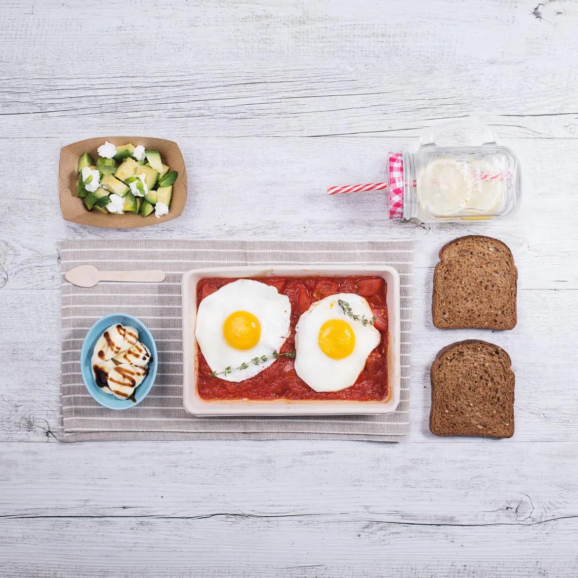- Uova al pomodoro, pane tostato e insalata di avocado